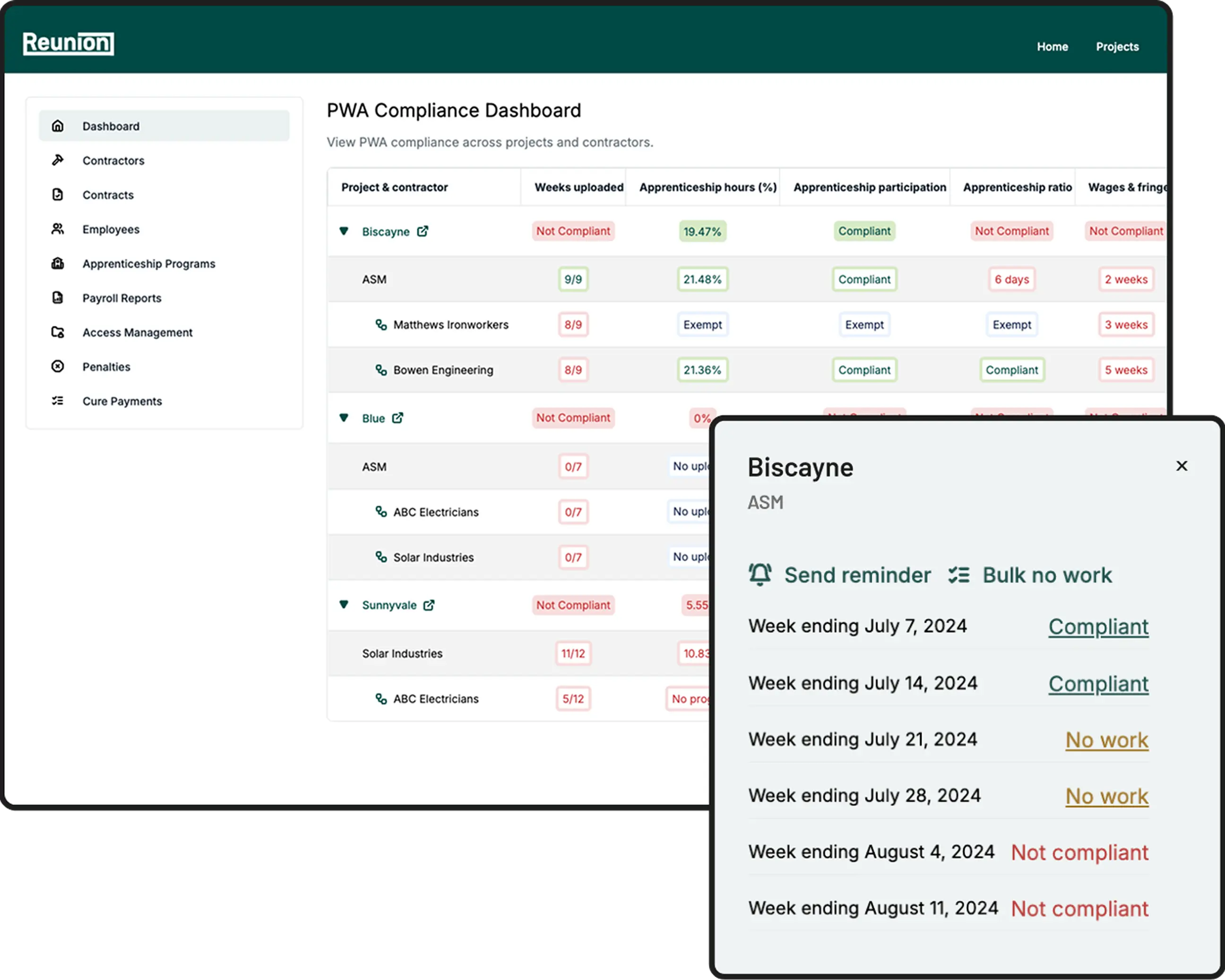 Reunion's Prevailing Wage & Apprenticeship (PWA) Compliance solution helps clean energy developers secure the full value of their tax credits by meeting stringent labor requirements. Our compliance software is integrated with our tax credit marketplace and streamlines PWA reporting, tracking, and audits, so you can stay ready to transact.