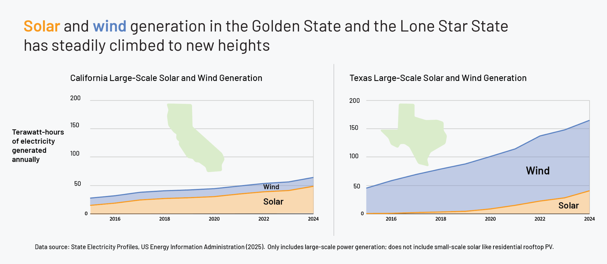 When it comes to clean energy in America, California and Texas are a central part of the story. The Golden State leads the nation in installed solar power, while the Lone Star State claims second place. Meanwhile, Texas produces far more wind power than any other state. The charts below track the remarkable year-on-year growth in electricity production from large-scale solar and wind in the nation’s two most populous states. (California’s vast adoption of rooftop solar isn’t presented here, but tells a similar growth story.)